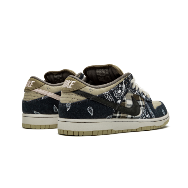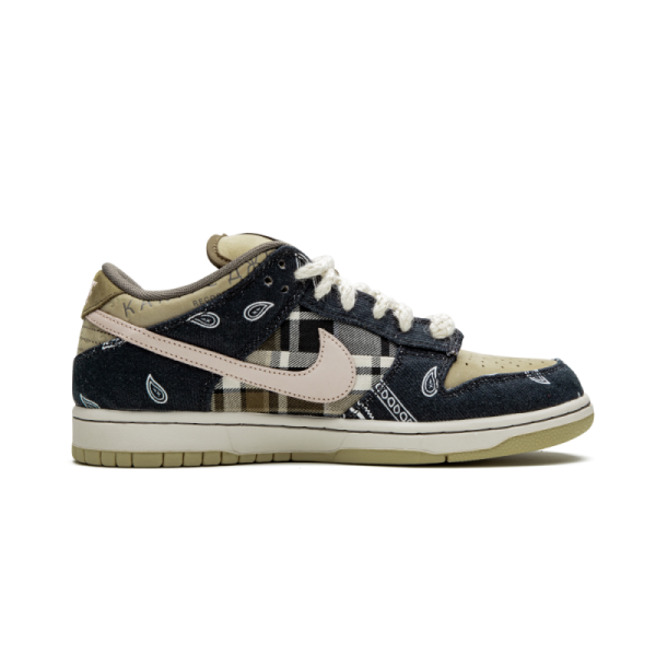 Después de volver a visitar varios modelos emblemáticos en Nike y Jordan con su estética “Cactus Jack”, Travis Scott regresa con una nueva interpretación de las Nike SB Dunk Low. Las Nike SB Dunk Low de Travis Scott tienen una base azul marino que combina estampados de pañuelos y estampados a cuadros. Las inserciones de color beige en la puntera, la lengüeta y el talón proporcionan contraste, mientras que los cordones de estilo tweed, una suela de dos tonos y un swoosh azul en el exterior y rosa en el interior completan el diseño sublime. Esta nueva colaboración de Travis Scott nos ofrece un par con un diseño único, materiales variados y colores suaves.
